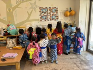 子ども達は先生に教わりながら、自分でゆかたを着て帯を結ぶことができました。