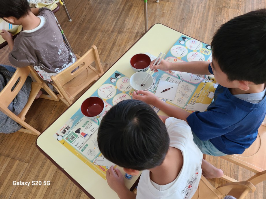 また、子供たちは動画を見ながら箸遣いの練習をしました。お箸で大豆をつまむのはむつかしかったですね。