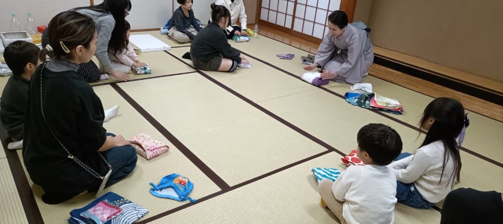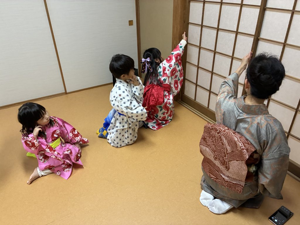 いつものように浴衣を着装したあとは、子どもたちが先月学んだ「襖の開け閉め」を復習。小さな手で丁寧に動く姿がとても微笑ましかったです。